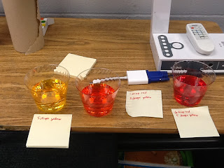 "Today in our STEM lesson we heard from a chemical engineer named Jenny who works for Creative Juice Company. She asked us to help her with some product research. She needs us to find out what color she needs to make their new strawberry orange juice. We decided we would collect our data in a graph. Then we mixed many color choices. As a class we picked the best 3."Emma